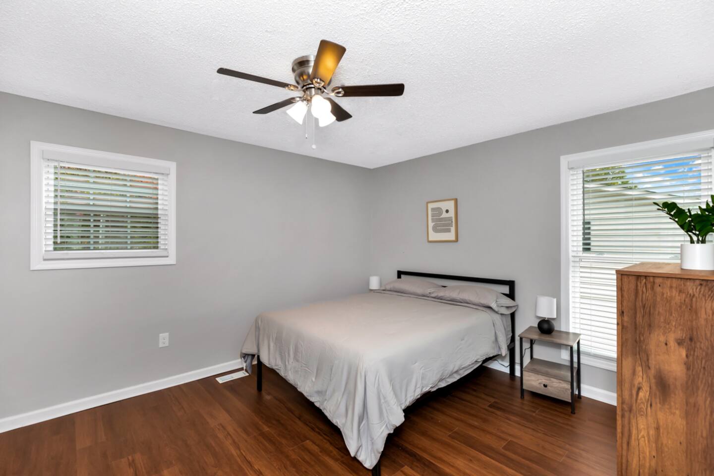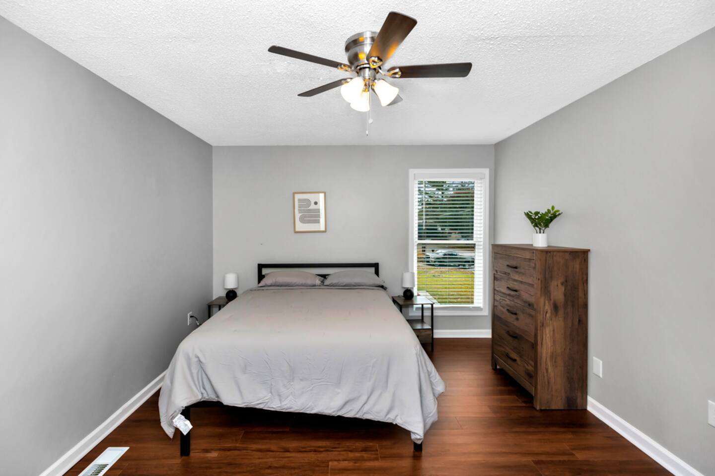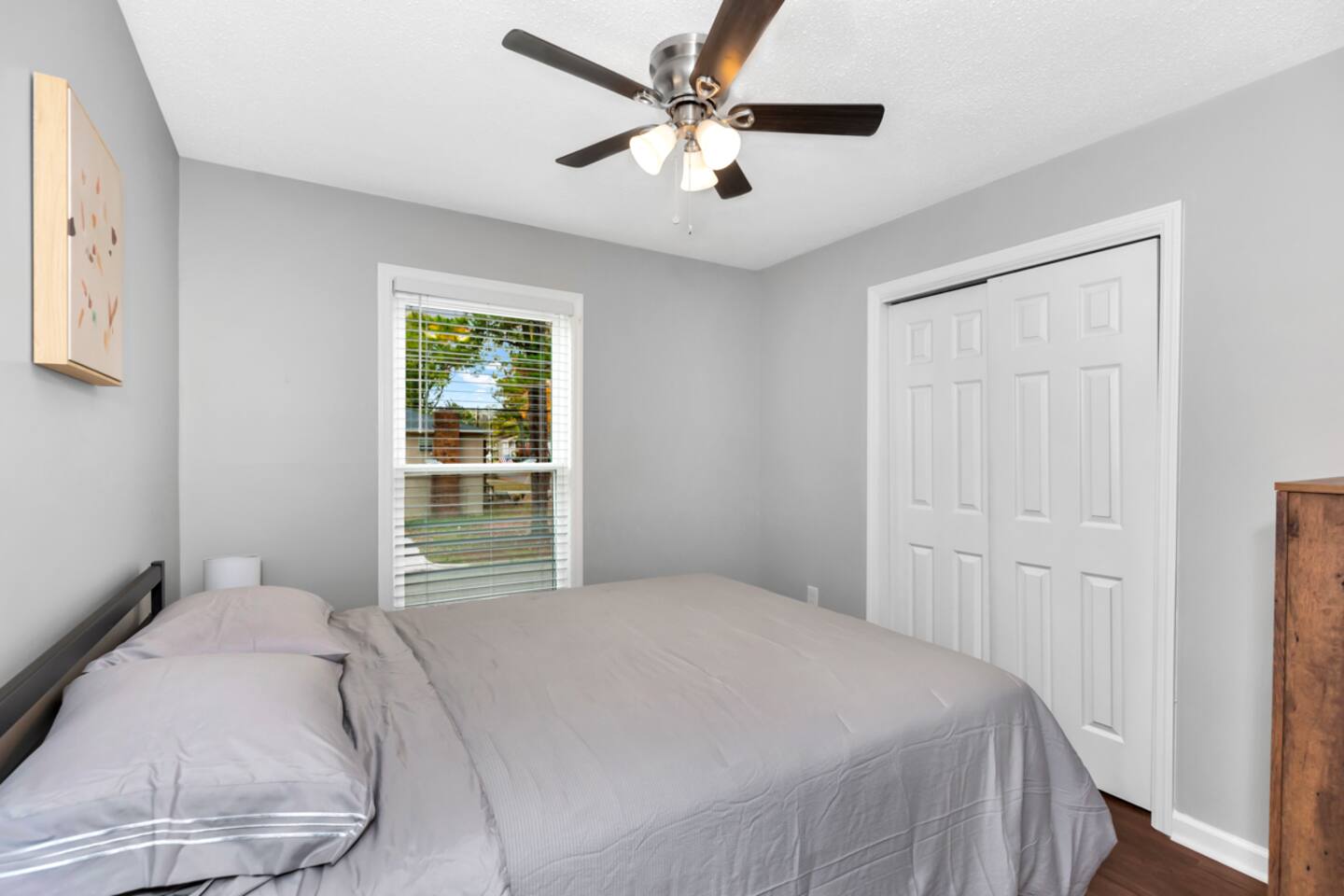 In this three bedroom, two bathroom home, all bedrooms have queen mattresses, as well as closets and dressers (so great storage for both short and long term guests). There is a separate room with a desk, chair and door that can be used an office. The kitchen has a Keurig coffee maker, toaster, microwave, electric stove and oven, as well as a full size refrigerator and freezer.