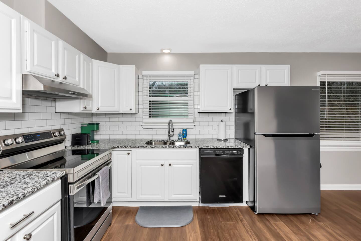 In this three bedroom, three bathroom home (1 full bath and 2 half-bath) , all bedrooms have queen mattresses, as well as closets and dressers (so great storage for both short and long term guests). There is a room with a desk, chair and door that can be used an office. The kitchen has a Keurig coffee maker, toaster, microwave, electric stove and oven, as well as a full size refrigerator and freezer. The living room is cozy and comfortable with new reclining couches. There is also a second upstairs living room with a reclining couch and television.