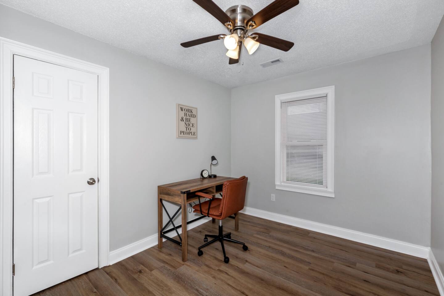 This is a remodeled 2 bedroom, 2 bathroom home, with a separate room used as a dedicated work space with a desk and chair. The living room, dining area and kitchen are part of an open floor plan, which allows guests to socialize with each other while cooking, eating and watching television. There is only one television in the home, and it is located in the living room area. There is a large backyard.