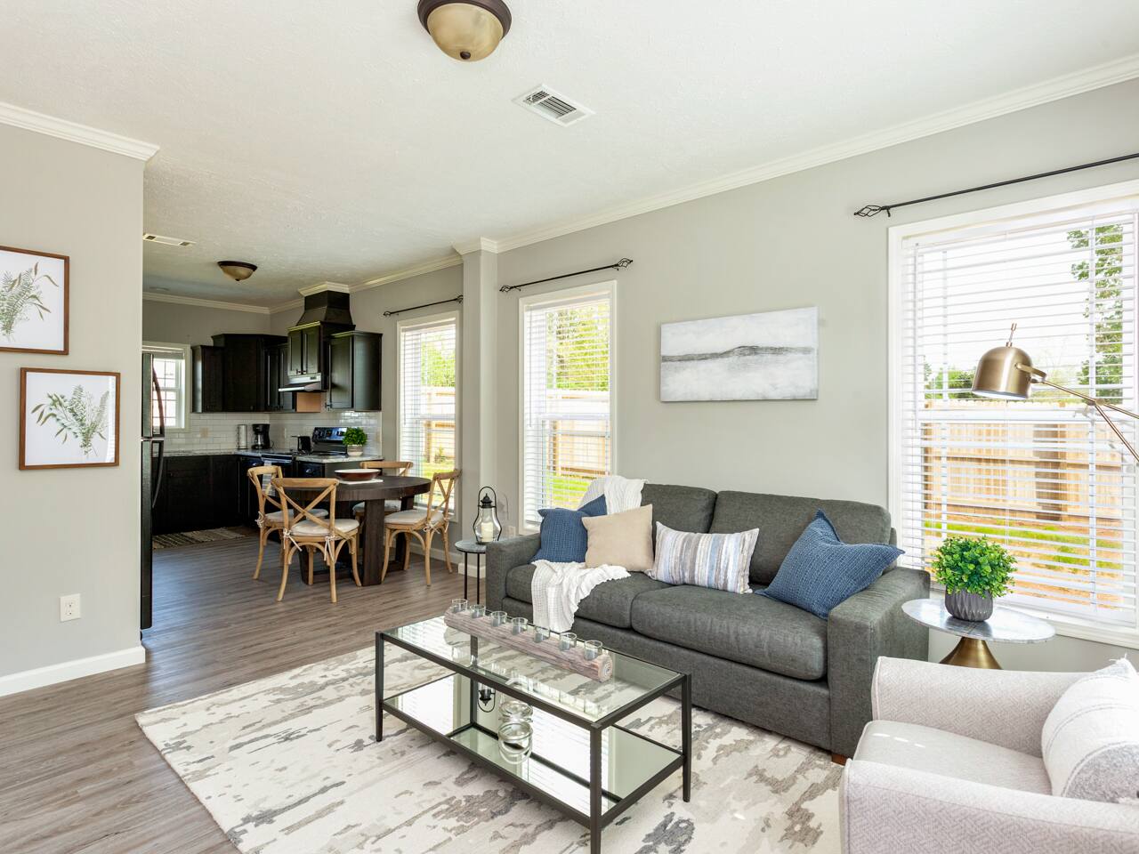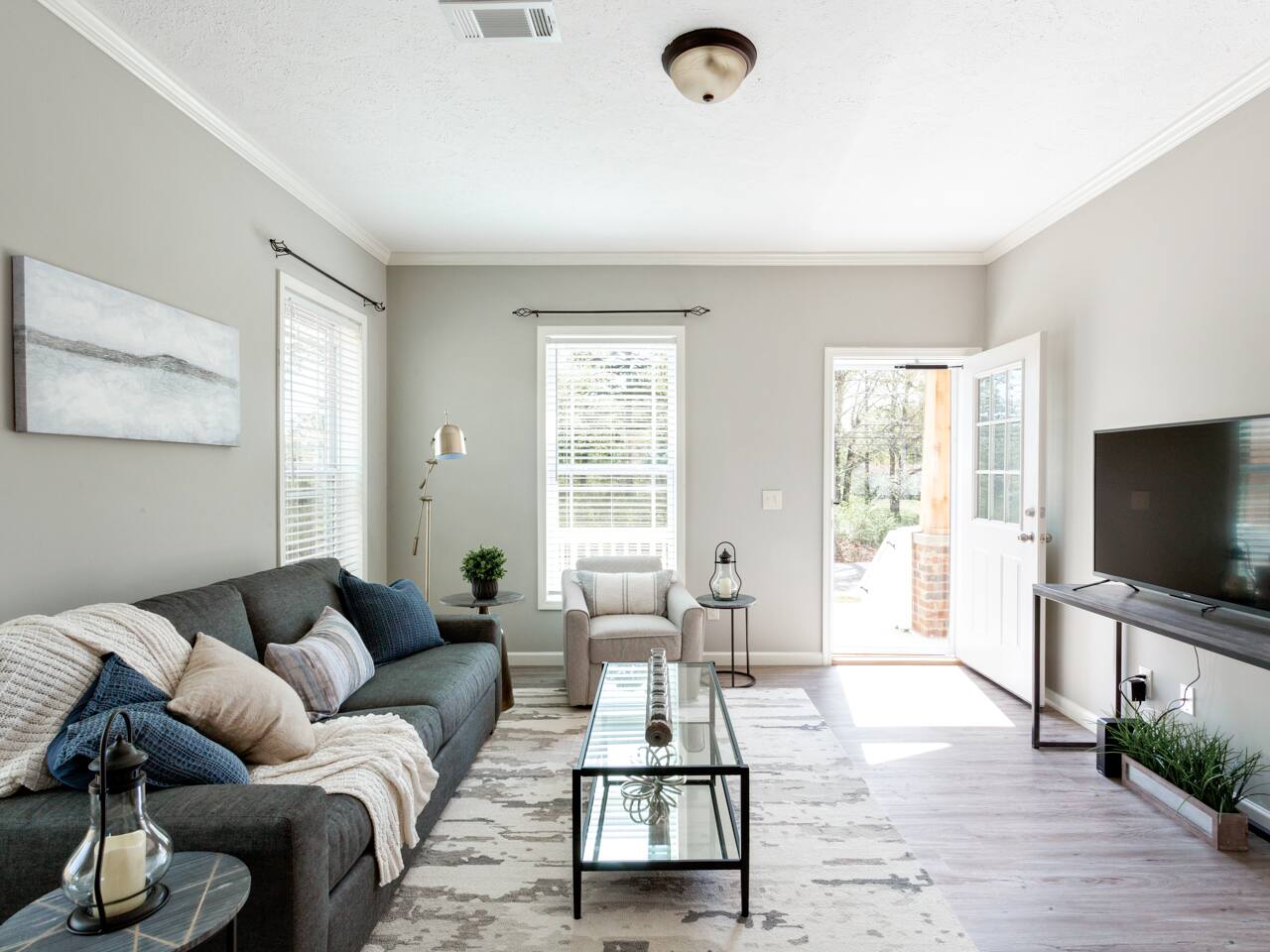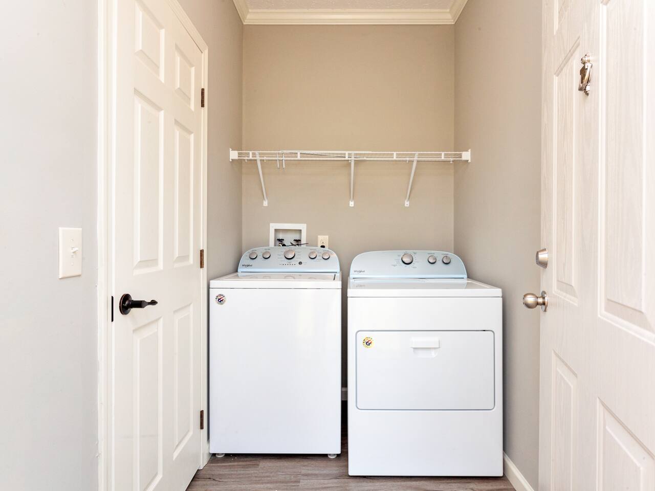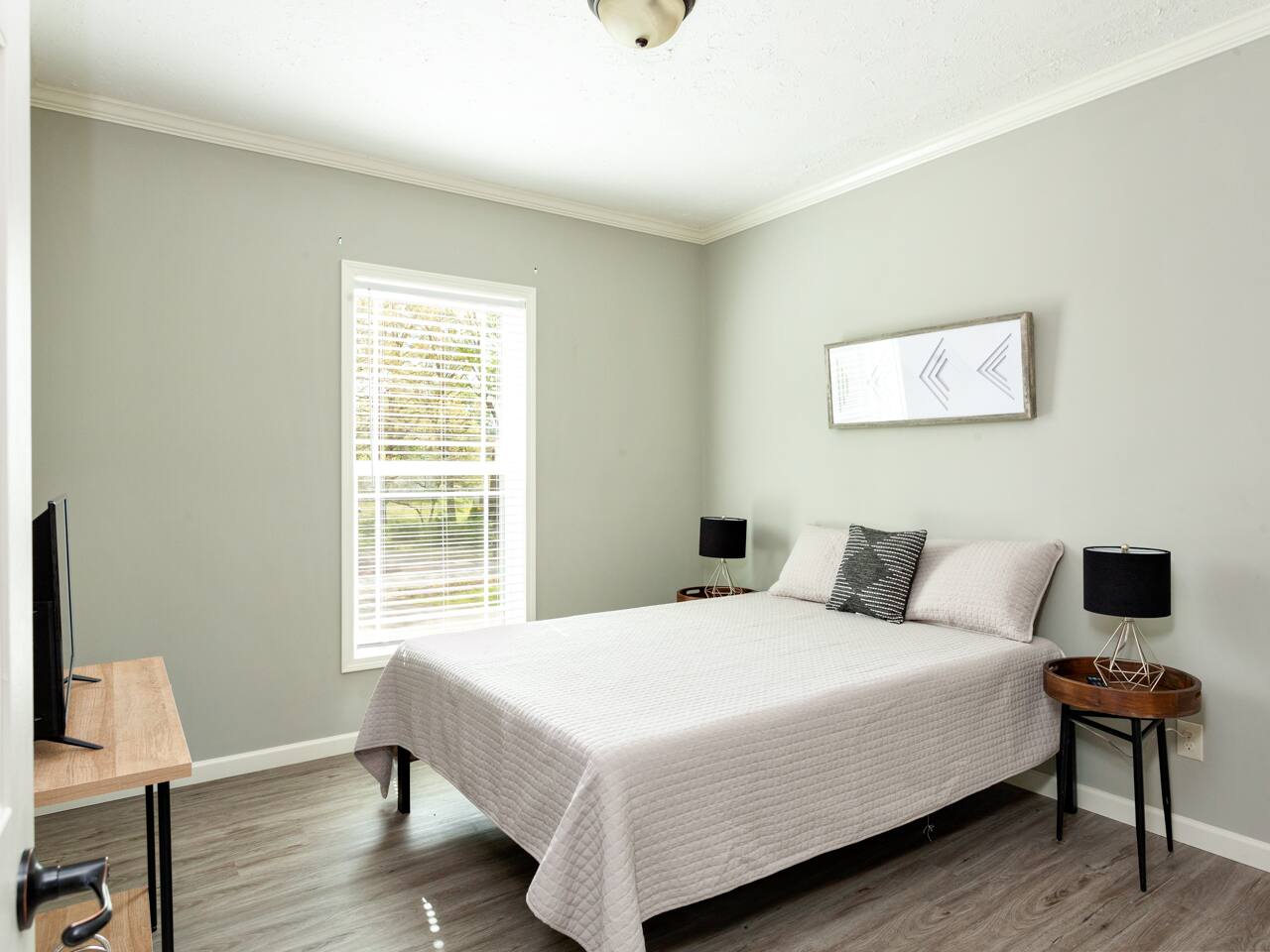 This is one half of a duplex. With separate entrances on different sides of the building, each unit has privacy and boasts two parking spaces. After stepping onto the covered craftsman porch and stepping into the home, guests are greeted with an open floor plan living room, dining room and kitchen combination. A short walk away are the bedrooms and bathroom. There is also a separate laundry room with a full size washer and dryer. The kitchen is fully equipped for cooking, and each bedroom has a queen sized bed and closet.